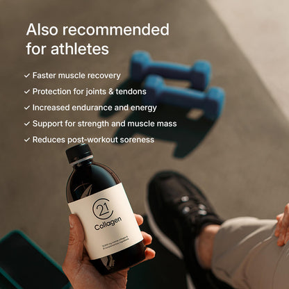 In the long term, including marine collagen in your daily routine can help maintain joint comfort and vitality. 21Collagen contains hydrolyzed liquid collagen , known for its superior bioavailability, helping to rebuild cartilage and reduce inflammation. Regular consumption supports flexibility and mobility, making it ideal for active people or those experiencing joint discomfort.