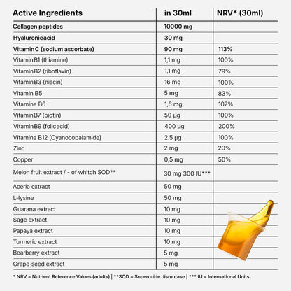Liquid marine collagen from 21Collagen contains an extensive list of the highest quality ingredients, including collagen peptides, hyaluronic acid, vitamin C, vitamin B, zinc, etc. Each ingredient has been studied in the most prestigious laboratories in the world, and on the 21Collagen website you can find details about the demonstrated effects of each ingredient in the 21Collagen formula in the “Studies” section.