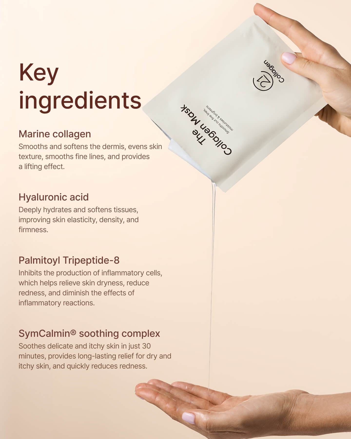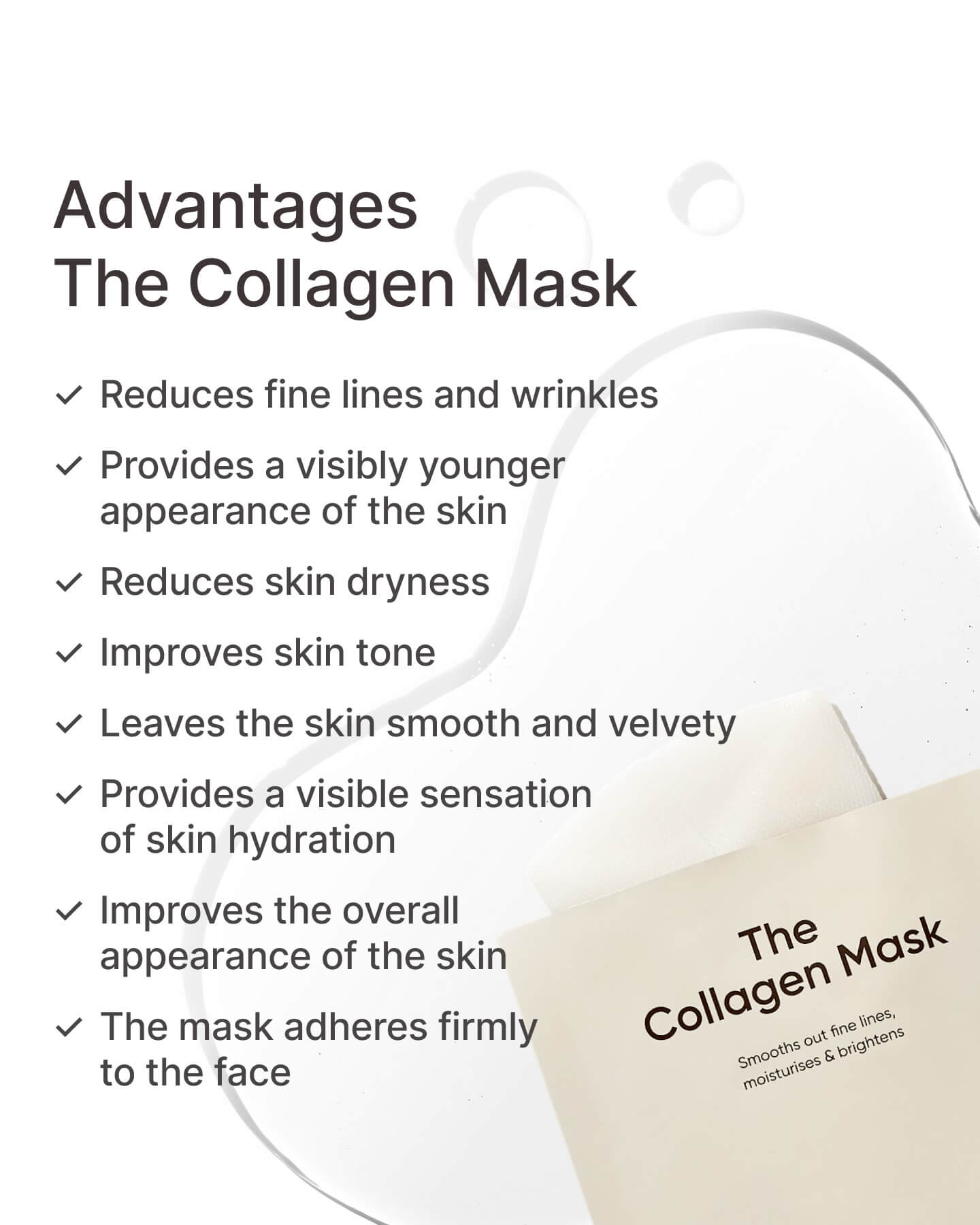 The Collagen Mask was designed for premium skincare. It is made from high-quality bio-cellulose and infused with a potent serum containing marine collagen, hyaluronic acid, and the soothing SymCalmin® complex. The mask helps reduce wrinkles, improve elasticity, and gives your skin a radiant, healthy appearance.