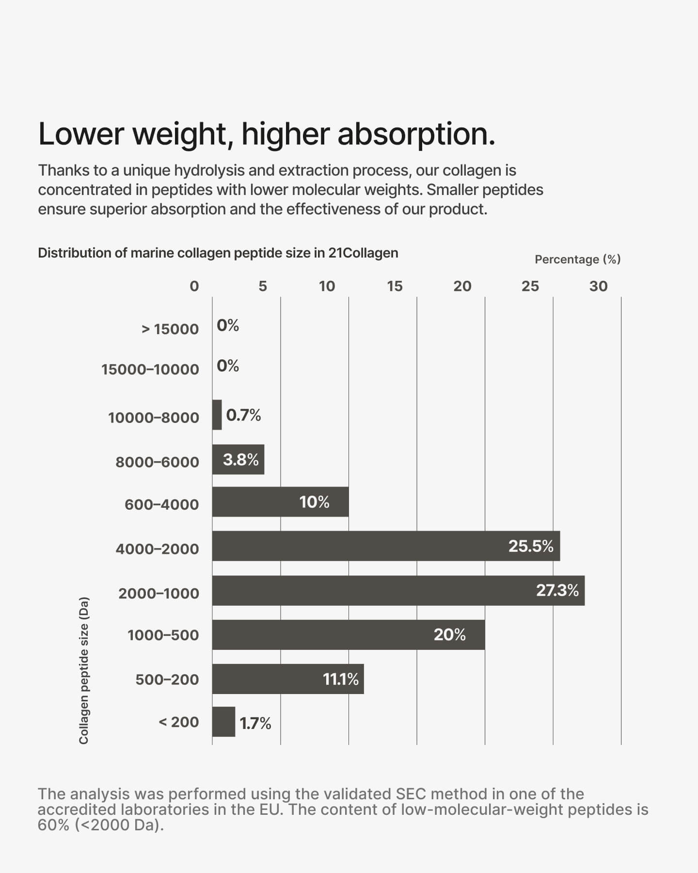 Unlike other types of collagen , marine collagen has an increased absorption rate, which ensures a faster distribution of nutrients in the body. 21Collagen is obtained from premium, certified ingredients to guarantee the purity and superior quality of the product.
