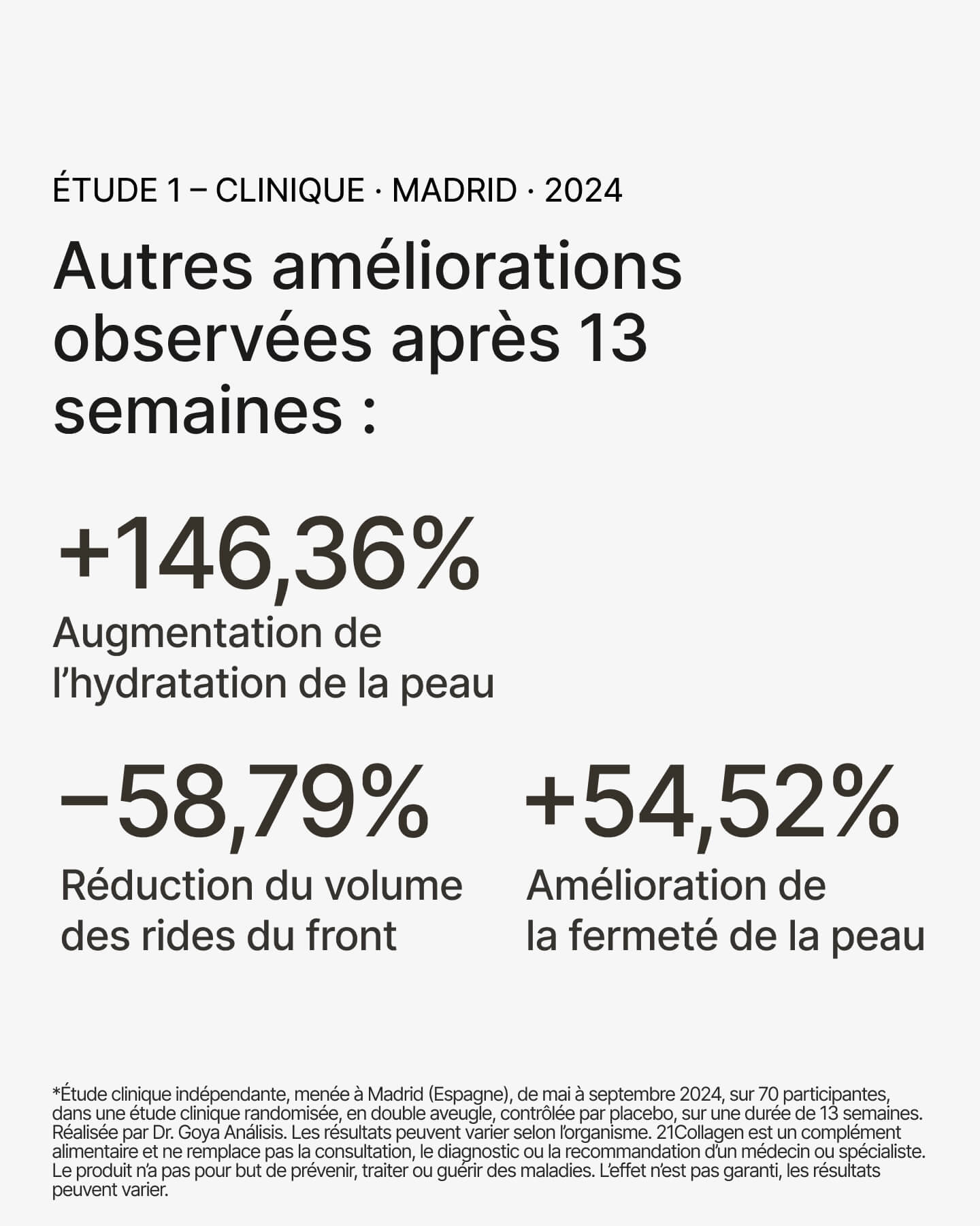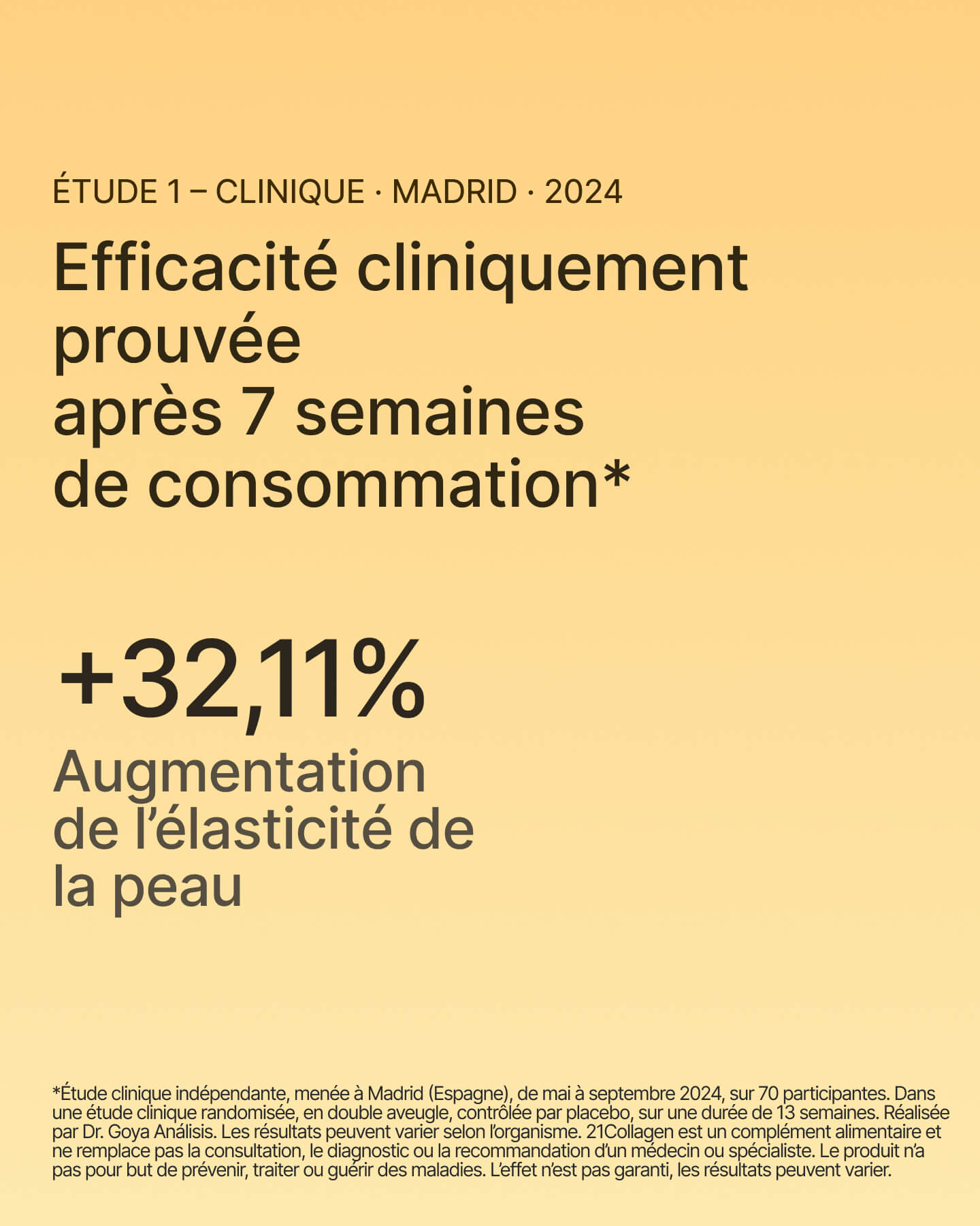 Les essais cliniques indiquent que, pour obtenir des effets optimaux, il est nécessaire de consommer le produit 21 Collagen pendant au moins 3 mois. Cependant, de nombreux utilisateurs peuvent commencer à observer des différences dans l'apparence de la peau, des cheveux et des ongles dès le premier mois de consommation. Il est important de maintenir une consommation constante pour maximiser les bienfaits du produit.