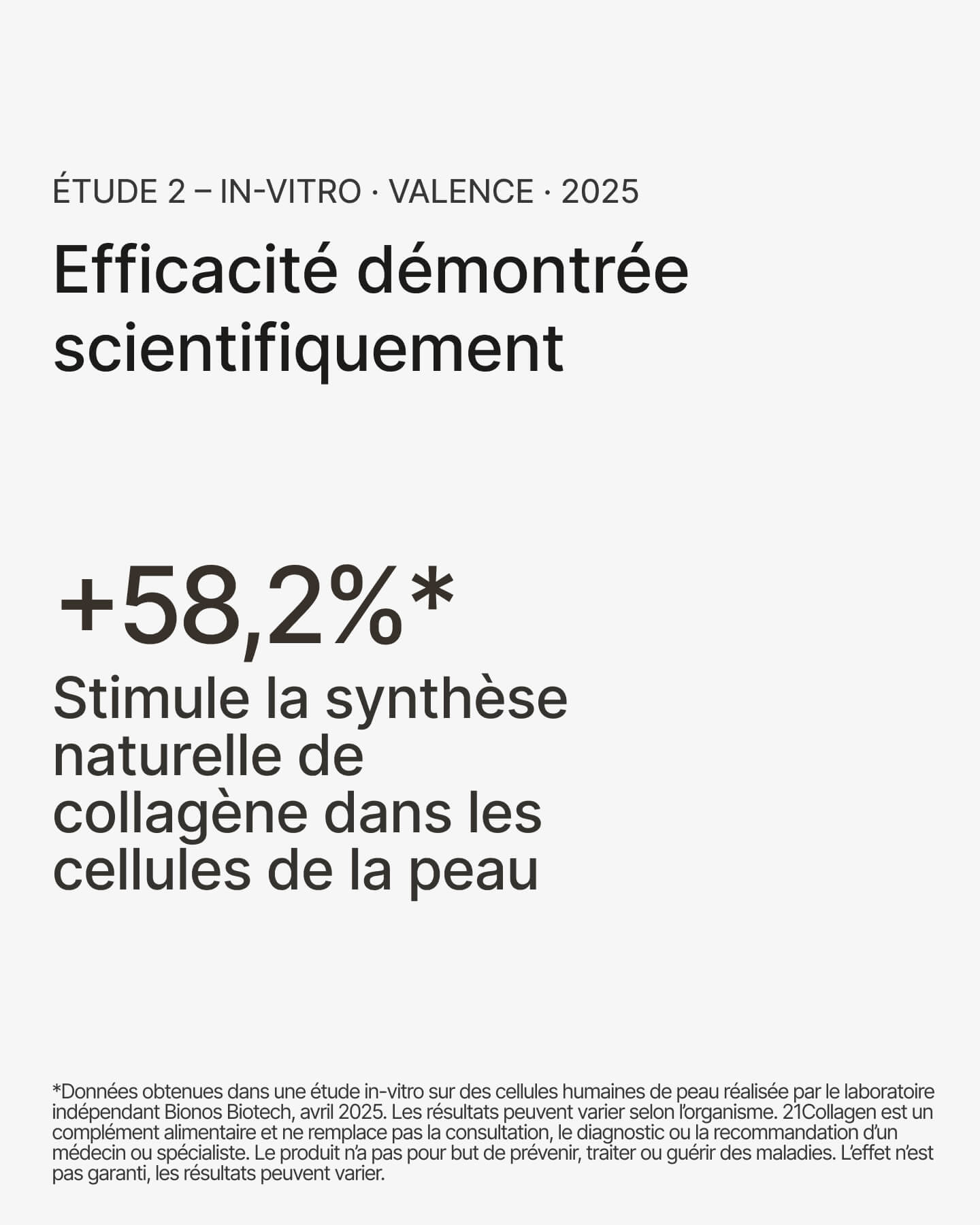 +80% d'amélioration de la synthèse naturelle de collagène. La peau et les cheveux retrouvent leur fermeté, contribuant à un aspect revitalisé et sain.