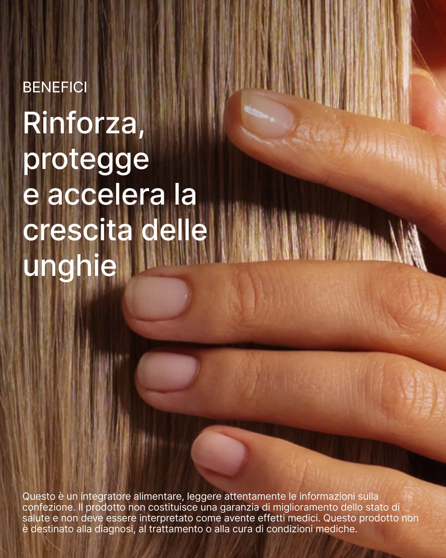 Lo zinco e il complesso di vitamine del gruppo B contribuiscono al rafforzamento delle unghie, riducendone la fragilità e la sfaldatura. Il collagene marino rafforza la struttura delle unghie, conferendo loro un aspetto sano e curato.