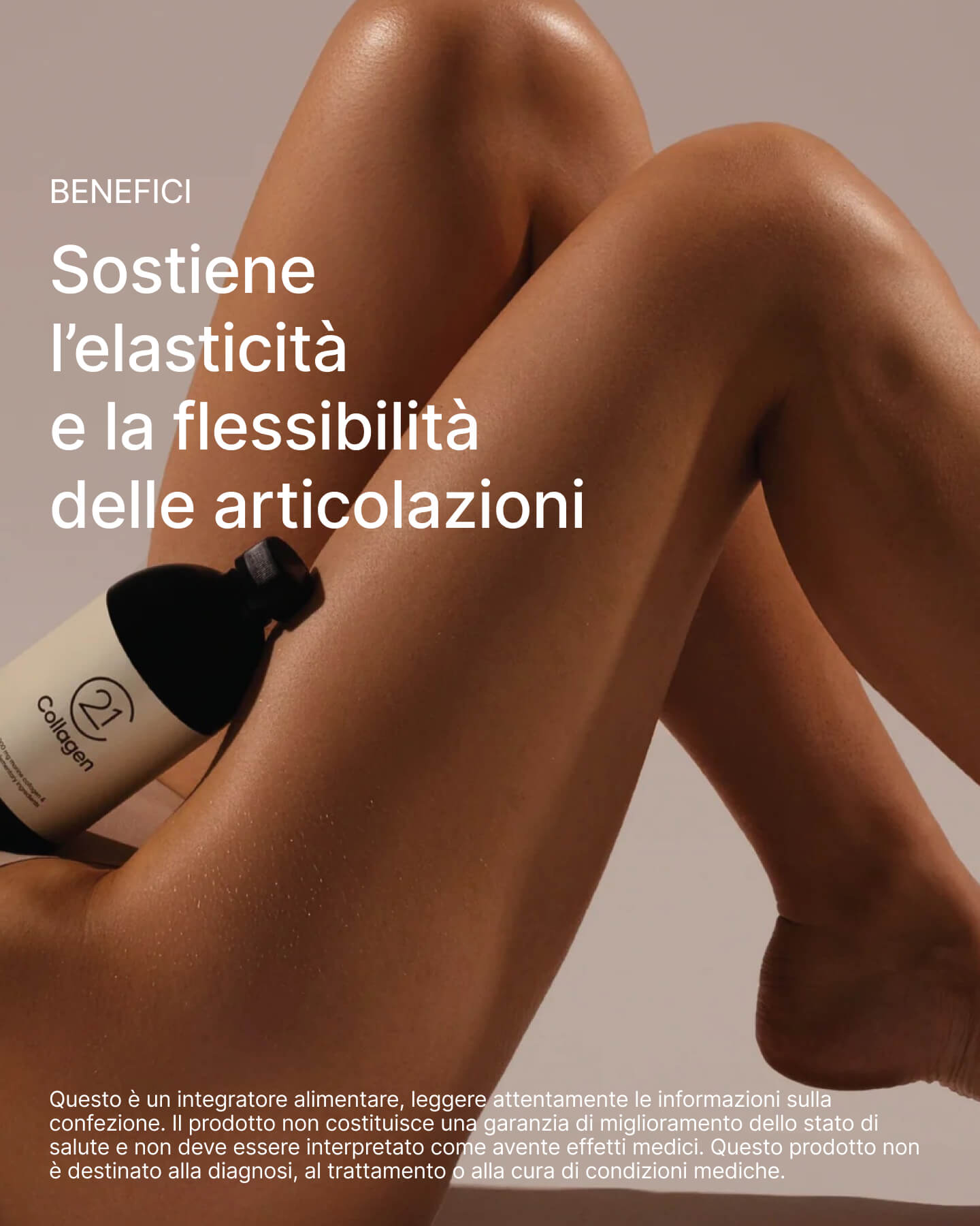 21Collagen contiene collagene marino che contribuisce a sostenere la salute e la flessibilità delle articolazioni, aiutando a proteggere il cartilagine e a ridurre il disagio articolare.