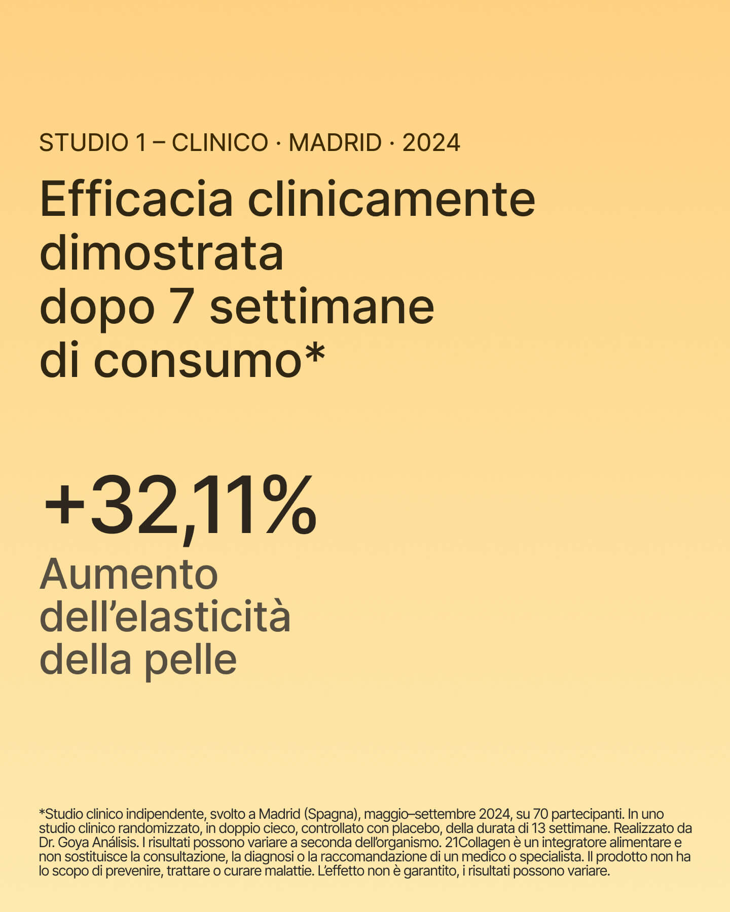 Le prove cliniche indicano che, per ottenere effetti ottimali, è necessario assumere il prodotto 21 Collagen per almeno 3 mesi. Tuttavia, molti utenti possono iniziare a notare differenze nell'aspetto della pelle, dei capelli e delle unghie già dalla prima settimana di utilizzo. È importante mantenere una regolare assunzione per massimizzare i benefici del prodotto.