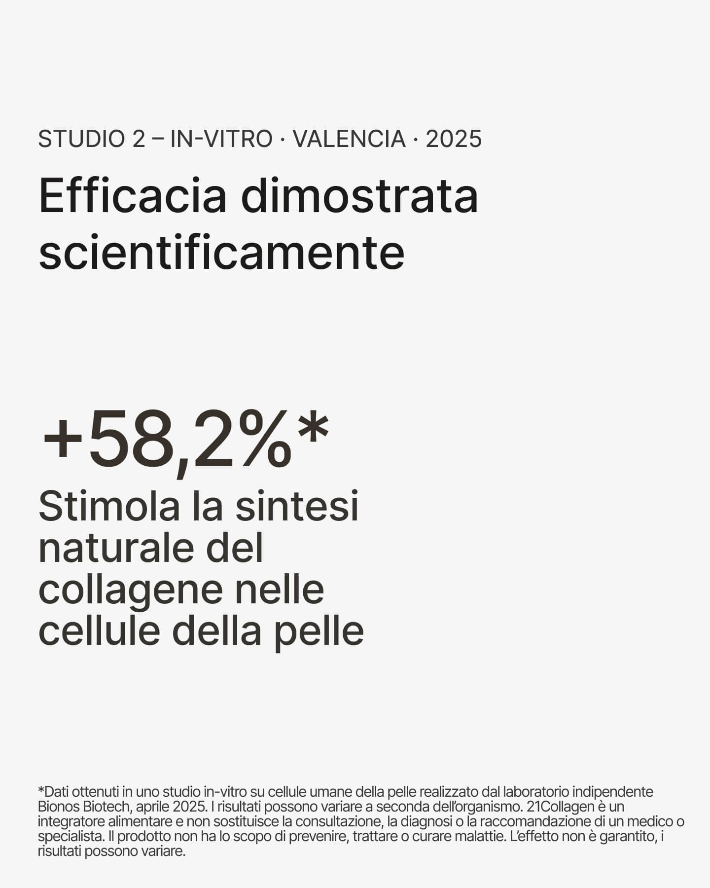 +80% miglioramento della sintesi naturale di collagene. La pelle e i capelli riacquistano fermezza, contribuendo a un aspetto rivitalizzato e sano.