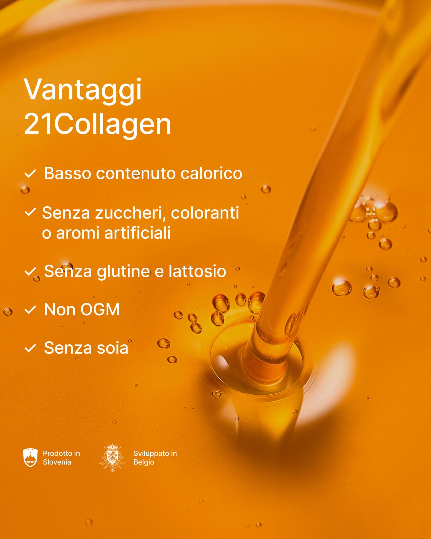 Una dose giornaliera di 21Collagen da 30 ml contiene solo 54 kcal.