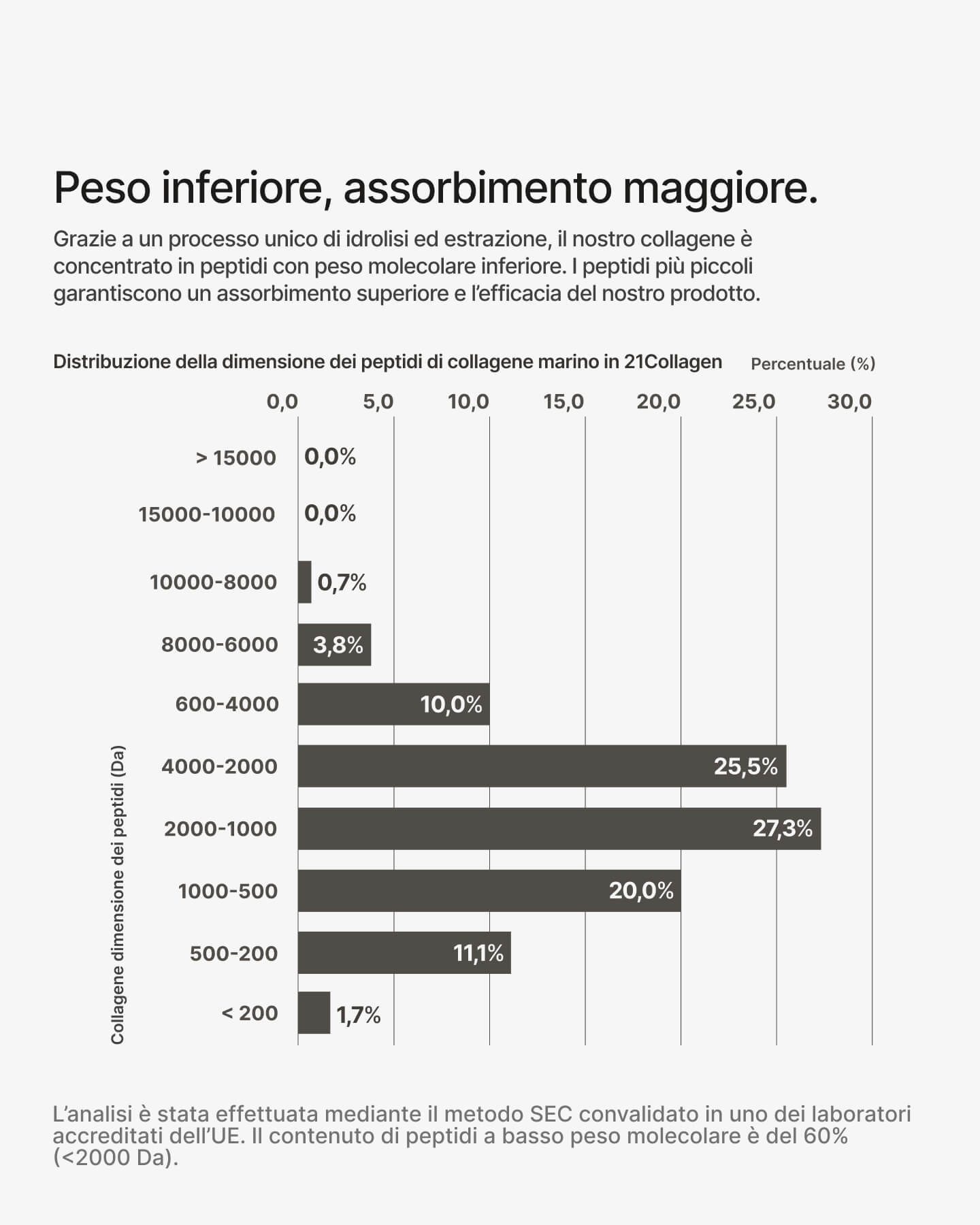A differenza di altreTipi di collageneIl collagene marino ha un tasso di assorbimento elevato, garantendo una distribuzione più rapida dei nutrienti nell'organismo. Il 21Collagen è ottenuto da ingredienti di alta qualità, certificati, per assicurare la purezza e la qualità superiore del prodotto.