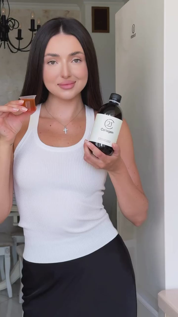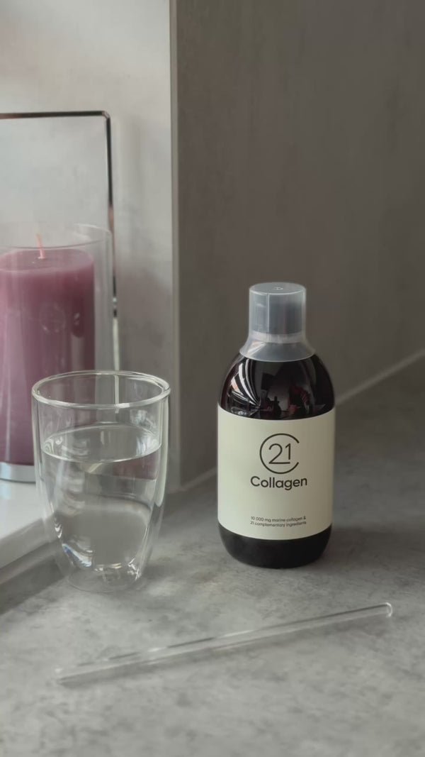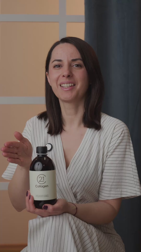 21Collagen è formulato come un liquido pronto all'uso, con una dose raccomandata di 30 ml al giorno. Può essere assunto direttamente o mescolato nella bevanda preferita. Agitare la bottiglia prima di versare la dose nel bicchiere. Si consiglia di consumarlo al mattino, prima della colazione.